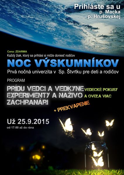 V piatok 25.9.2015 bude opäť naprieč celou Európou prebiehať festival vedy „Európska noc výskumníkov“. Tradične sa aj na Slovensku popularizačné podujatia odohrávajú vo veľkých mestách.